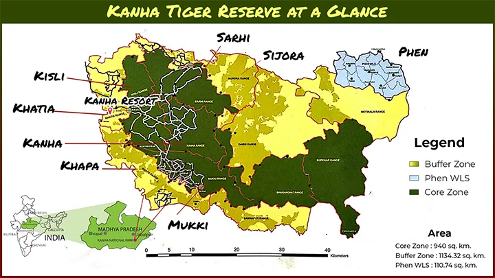 Kanha National Park divides itself into several carefully planned safari zones, offering visitors the opportunity to explore diverse landscapes and habitats. Kanha Tiger Reserve encompasses a total of 8 safari zones, including 4 core zones of Kanha, Kisli, Sarhi, and Mukki. The 4 buffer zones includes Khapa, Khatia, Pehn and Sijora. Each safari zone in Kanha National Park presents a distinct adventure, ensuring that visitors have an immersive and memorable wildlife experience.
